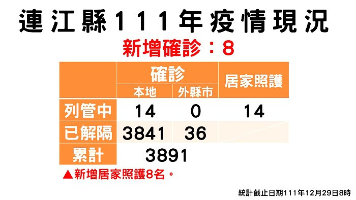 指揮中心昨天公布新增確診個案8名,案例分佈東引鄉4例、南竿鄉3例、北竿鄉1例。指揮中心統計,本縣今年累計確診3891名,列管個案14名,居家照護14名(新增8名);個案病況皆穩定,已有3877名病患康復解除隔離出院;居家隔離無新增,無人列管;自主防疫無新增,無人列管。