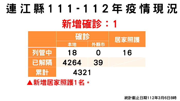 縣疫情指揮中心6日公布新增1名確診,案例在南竿鄉;累計共4303位病患康復解隔。(圖:連江縣疫情指揮中心)
