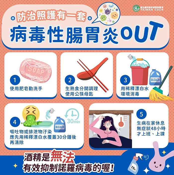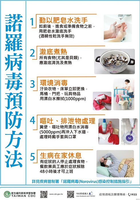 衛福局表示,為讓大家瞭解防治諾羅病毒小撇步,疾管署、食品藥物管理署已分別製作病毒性腸胃炎衛生教育、諾羅病毒防治相關資料,可逕至衛福部疾病管制署全球資訊網或衛生福利部食品藥物管理署首頁防治食品中毒宣導單張下載參考,網站亦有其他防治食品中毒手冊、海報及單張,歡迎民眾及業者下載運用。