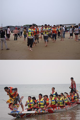 100年莒光鄉海上龍舟競賽今日開賽,今年擴大舉辦的賽事邀請來自四鄉五島隊伍參賽,來自南竿、北竿、東引的選手昨日中午已陸續進駐東、西莒,稍作休息後,下午南竿、北竿鄉選手們來到猛澳澳口,坐上龍舟加緊練習,趁著海象平穩,選手們在猛澳海域來回滑行,所有選手聽著鼓聲,配合節奏,確實做好划槳動作,雖然絕大多數選手是第一次划龍舟,但可能是隊友均為熟識的朋友、同事,已具備基本默契,在試划幾趟後都能漸入佳境。
