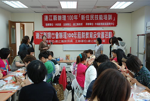 【記者劉秋月/南竿報導】外籍配偶家庭服務中心持續辦理「新住民技能培訓」課程,繼中國結、手工拼布製作課程後,日前則進行蝶古巴特收納盒及萬用袋的製作,美麗的東西總是令人動心,擠滿教室的學員大家都動手DIY,而婦女會則共同辦理租稅教育宣導活動,宣導各項稅務資訊,協助外配的社會融入。
