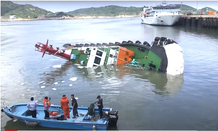 「台港13302」拖駁船,昨天上午10時左右發生傾斜進而沉沒,據福澳安檢所安檢人員提供即時記錄資訊,10時7分,巡查時發現「台港13302」拖船傾斜(持續下沉),即巡三線系統回報;10時8分,通報第十海巡隊值日室,獲復將緊急派遣CP-1052艇前往協處;10時12分,本國籍「光華34125」舢舨抵達現場協處;10時16分,CP-1052艇出南竿福澳港;10時21分,CP-1052艇抵達現場協處,並佈放遙控式救生圈實施救援;10時23分,「台」船5名船員全數由「光華」船救起;10時24分,「台」船已沉沒;10時30分,福澳安檢所人員發現「台」船沉沒處有油污情事,油污範圍待查。