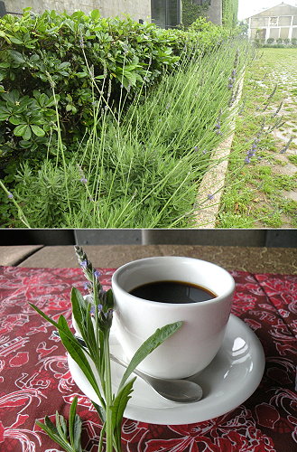 最近到店裡有一種薰衣草咖啡,原來是店內小姐的創意之作,把外面種植的薰衣草拔一些葉子下來洗淨,跟咖啡一起煮,煮出來的咖啡充滿了新鮮薰衣草的香氣,讓喝咖啡這件事增加不少浪漫的氣息。