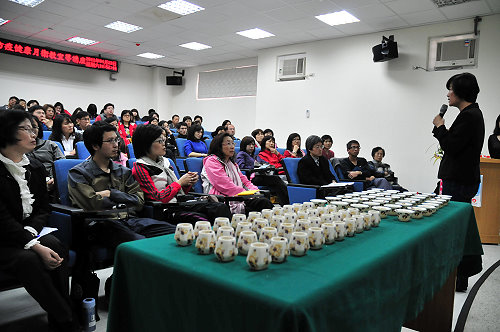 下午是重頭戲「精彩重現-世博台灣館的故事」,邀請到世博台灣館執行長龔維新主講,她是有備而來,包括展出與台灣館內同品質的720度立體影片、主題曲「台灣的心跳聲」,還有現場泡給來賓品茗的阿里山高山茶,都是原滋原味呈現給現場學員,也讓許多去年未能去上海躬逢其盛的學員們是大呼過癮,現場也比照台灣館贈送每位學員品茗用的紀念茶杯。龔維新強調,台灣館帶給世人的感動,會持續發光發熱,而成功的背後,靠的是大家的創意發想、甚至克服萬難建造誕生,並於世博會期間創造「因心而大」之耀眼光彩,成功行銷世博台灣館;精彩演說讓學員們深感不虛此行。