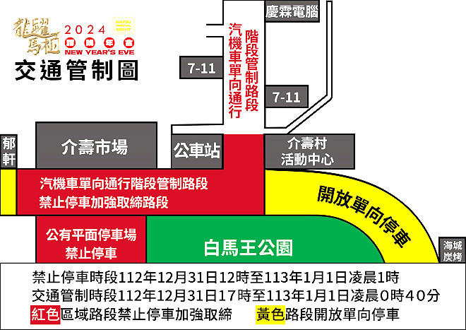 二、禁止停車區域為介壽村老人活動中心以南、介壽市場以東區域(含公有平面停車場),管制時間為112年12月31日12時至113年1月1日凌晨1時。