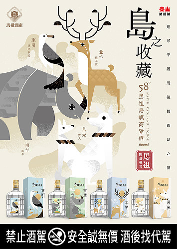 【本報訊】馬祖酒廠攜手泰山首次推出守護島嶼系列「島嶼紀念酒」,結合四鄉五島名勝及文化特色,打造出東引、北竿、南竿、莒光四款限定高粱酒,清新童趣圖樣風格,用四種動物勾勒四鄉特色,讓飽覽馬祖風光的遊客在離開時能帶上一套離島專屬酒款,回味馬祖旅行的美好記憶,預定4月下旬開賣。