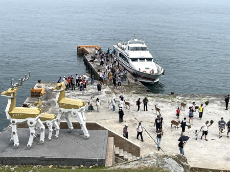 【本報訊】端午連假第一天,北竿大坵島8日上午迎來約3百位遊客,此時島上梅花鹿均已換上亮麗的夏毛,有二十多頭梅花鹿在碼頭迎賓待餵,遊客近距離體驗餵食樂趣,也飽覽島上風光。