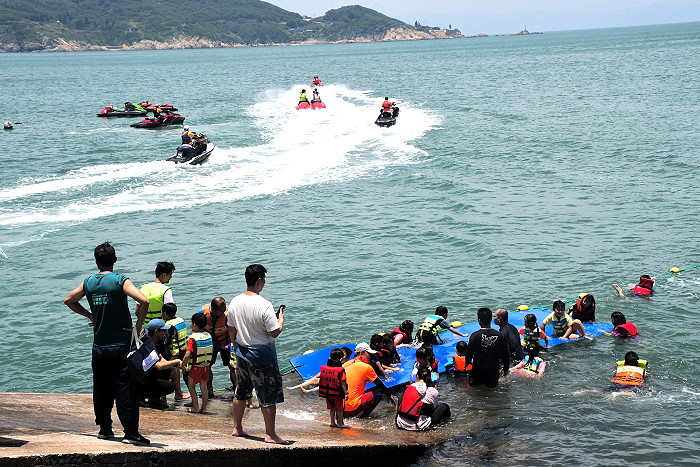 緊接著就是大家期待已久的水上遊憩活動體驗,主辦搬出包括水上鋼鐵人、獨木舟、橡皮艇、香蕉船等均免費參加,還有7輛跨越台灣海峽,由桃園騎過來馬祖,桃園水上摩托車救援協會,並另載運12輛水上摩托車,全部都可以免費暢玩,吸引一波接一波的鄉親排隊要下水清涼一下,尤其最受歡迎的水上鋼鐵人體驗共同起飛,不少馬祖鄉親緊張上陣,飛上半空中興奮大聲尖叫,活動全程都有救生員戒護安全,讓大家玩得開心、平安回家。