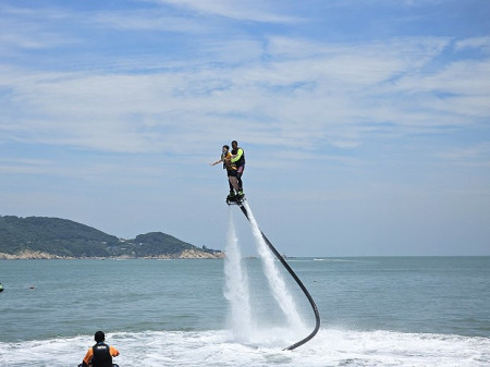 113年運動i臺灣計畫2.0海洋多元推廣親子體驗23日在福澳救生大隊廣場歡樂登場,最受矚目的水上鋼鐵人設備帶鄉親起飛。(圖/文:曹重偉)