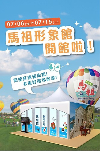 【本報訊】台東熱氣球節將在7月6日盛大登場,馬祖形象館外觀搶先亮相,擷取馬祖特色元素打造的馬祖形象館,不僅吸睛更乘載滿滿好康,要讓大家看見馬祖的「嶼眾不同」。7月6日至15日到鹿野高台欣賞熱氣球,記得順遊馬祖形象館,好康獎不完,拍照還有機會把馬祖雙人來回機票、馬祖住宿券、馬祖伴手禮等大獎抽回家!