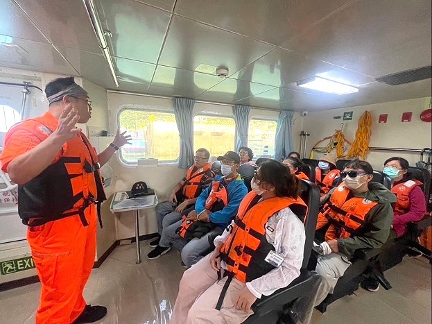 並由金馬澎分署莊主任秘書授課「海洋安全概念與實務」及第十海巡隊巡防艇(PP-10072)搭載教師進行「海上巡弋及實務觀摩」課程,藉資深艇長解說航儀裝備及海域工作流程,讓學員體驗海巡的勤務日常。