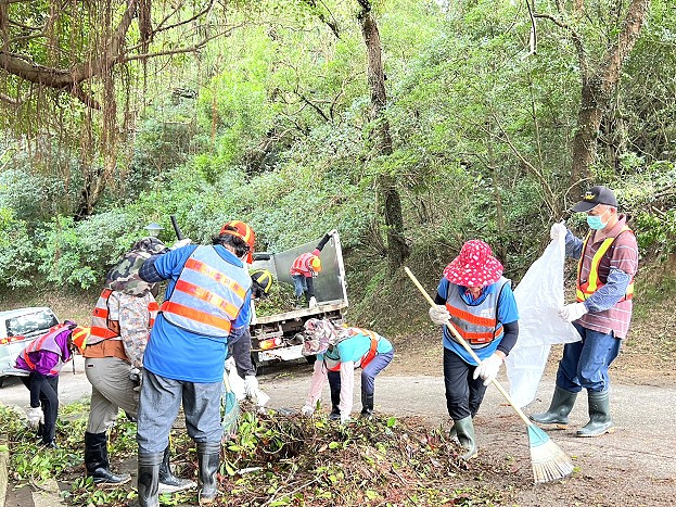 這次颱風對環境造成不小破壞,除了大量樹木攔腰折斷阻礙交通,落葉殘枝也影響道路安全與溝渠阻塞,南竿清潔隊、環資局、產發處同仁,以及國軍官兵通力合作,加速環境復原,共同清淨家園。