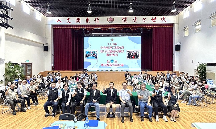 之後由曾玉花進行連江縣社會福利績效考評簡報,指出本縣位於離島且為全國人口數最少的縣市,導致先天資源不足,加上後天專業人力缺乏,因此無法像其他縣市一樣交出完美的成績單,但我們有百分百的服務熱誠,秉持著以人為中心的個別化照顧,推出各項亮點政策。
