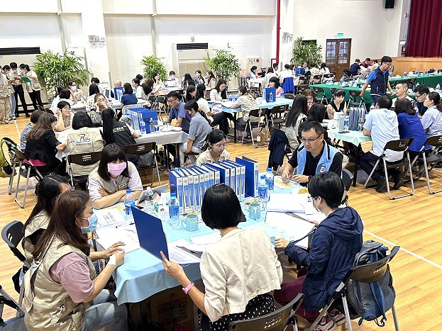 之後前往介壽國中小進行實地考評,現場依業務分成10組,分別是公彩盈餘組、婦女福利及家庭支持組、保護服務組、身心障礙福利組、老人福利組、兒少福利組、社區發展組、志願服務組、社會救助組及社工專業組等組別,再由業務督導委員入席訪談。