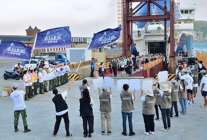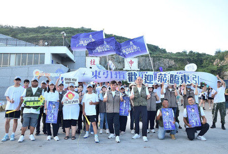 東引軍事越野障礙賽登場,鄉公所、鄉代會、東指部隆重在中柱碼頭迎賓,熱情歡迎登島的跑者、遊客。(圖/文:陳其敏)