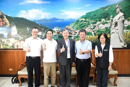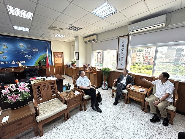 勞動部次長許傳盛(中)、職安署長鄒子廉(左一)、職安署北區中心主任曹常成(右二)拜訪縣長王忠銘,肯定馬祖率先獲得金安獎。(圖/文:曹重偉)