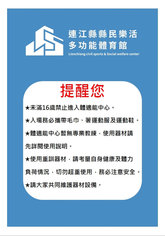 連江縣縣民樂活體育館體適能中心公告場地管理規範,未滿16歲禁止進入。(圖:教育處)