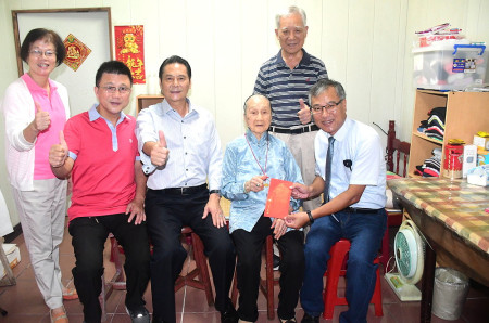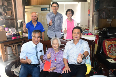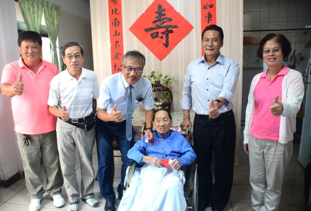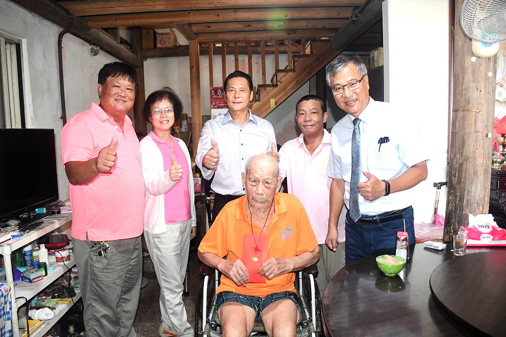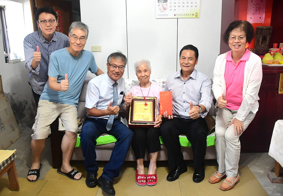 上午9時開始,王忠銘一行依序走訪5位人瑞,誠摯祝福老人家身體無恙、健康快樂,除代表縣府致贈1萬元敬老禮金之外,並代表總統府致贈金質的敬老狀(剛好100歲才有)及衛福部致贈的金鎖片,老人家戴黃金拿紅包,喜氣洋洋,家屬們也都相當高興。