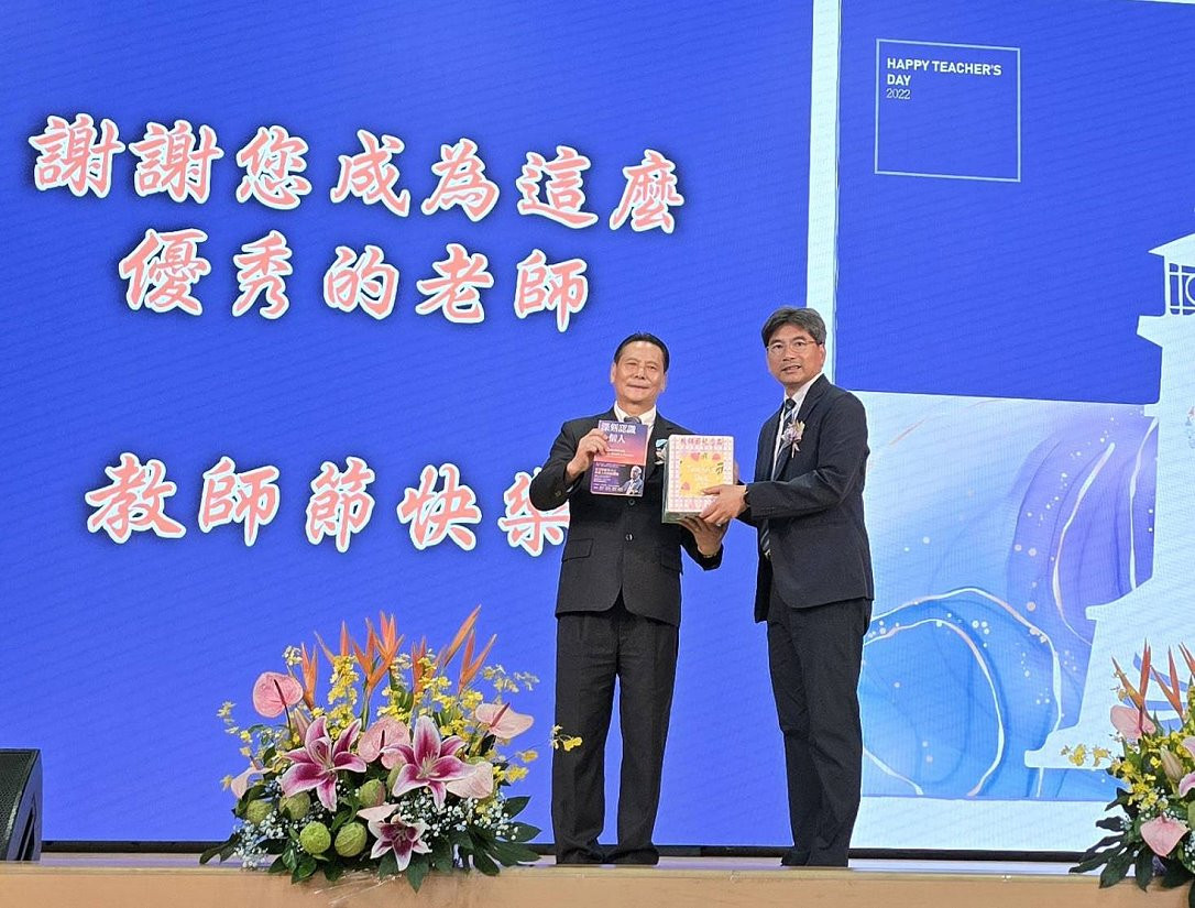 (上圖)慶祝113年教師節,教育處25日提前舉辦今年度表揚大會。(下圖)縣長贈送教師節紀念品,由今年度師鐸獎獲獎者陳功德校長代表收下。(圖/文:曹重偉)