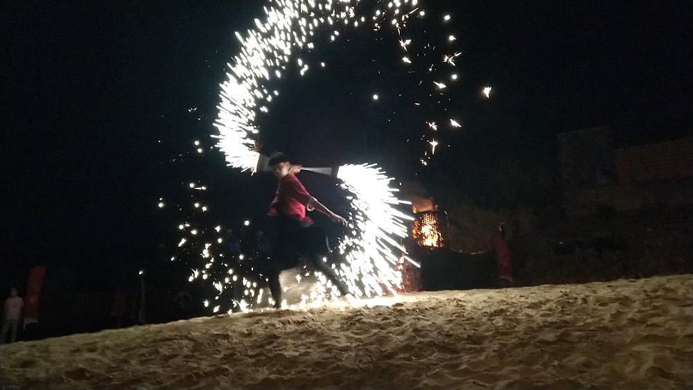 接續表演的是天威響藝的火舞表演,表演團體運用火焰燃燒威攝人心的力量,舞者們將自身的生命故事作為靈感發想,透過獨一無二的曼妙身姿,在鐵板沙灘上呈現震撼又靈動的藝術表演,以各種武術動作結合豐富神秘東方色彩的表演,展現出獨特的火焰舞姿,同時還加入肢體、音樂、舞蹈等,幻化出熊熊燃燒的火焰創作藝術,表演者們自信隨意的甩著火棍、道具,搭配著音樂,讓現場觀眾感到驚艷不已,直呼太難得一見、太精彩了。