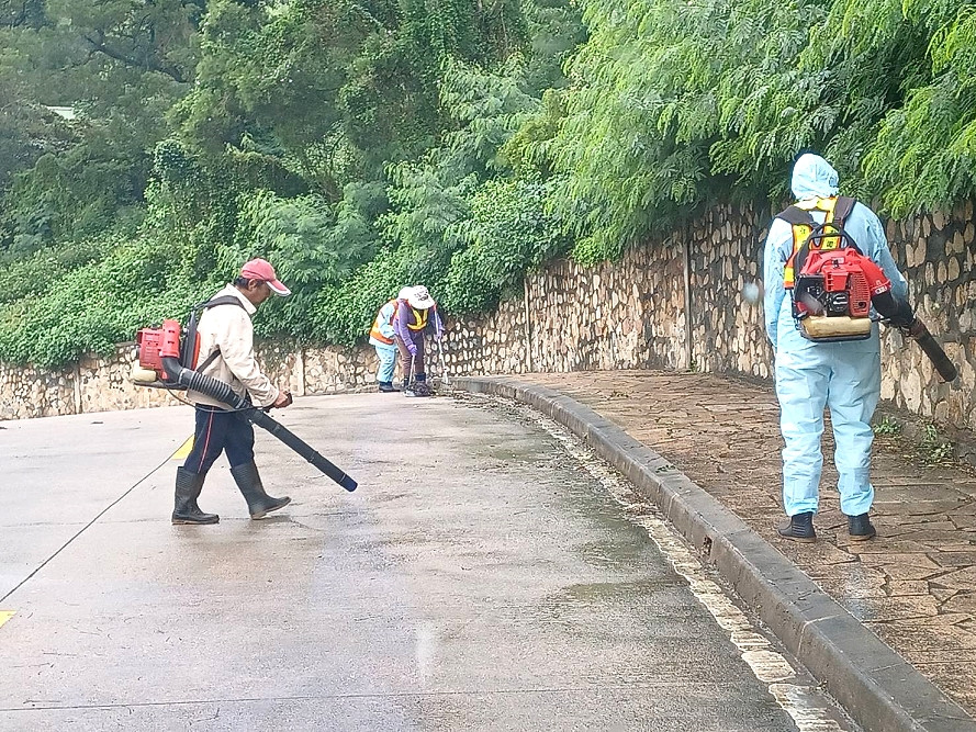 地區5日仍有部分雨勢,但清潔同仁仍然停休工作,針對南竿主要路段執行環境復原工作,將路面上被打落樹枝、樹葉逐一清掃裝袋,以最快速度將環境恢復成原來美麗樣貌;除此之外,不少落葉覆蓋水溝蓋、阻塞溝渠,清潔隊員一一清除,維護溝渠排水暢通。