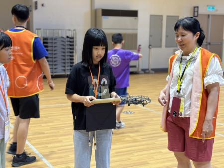 今日營隊進入重頭戲,學童們運用所學進行機器人投石挑戰與無人機操控PK賽,現場氣氛熱烈、笑聲不斷,展現學習成果與創意活力。台灣大哥大副總經理暨基金會執行長劉麗惠、教育處長王禮民也特地到場,為孩子們加油打氣。