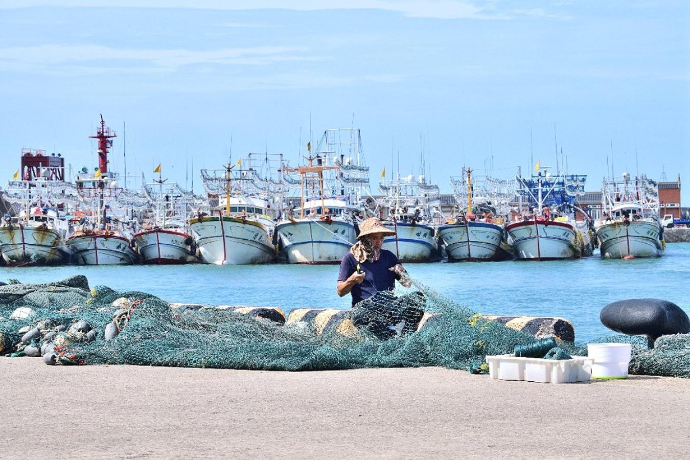 東引,是距離「樺加沙」颱風最遠的鄉鎮,儘管威脅減弱,但受外圍環流影響,海上風浪仍明顯增大。除了吸引數十艘台灣漁船進港避風之外,當地漁船也全面停止出海,漁工們則把握這段空檔,忙著修補漁網、整備漁具,為下一趟出海做準備。