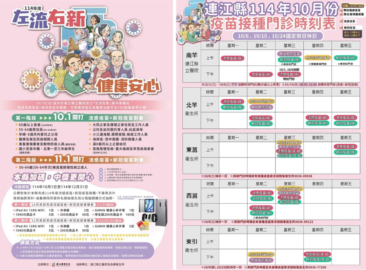 「左流右新,健康安心,中獎更開心」是本縣衛生局今年特別企劃的主題加碼活動,藉由抽獎活動,提升民眾接種意願,12月31日前於本縣完成114年度流感疫苗+新冠疫苗接種(包含門診接種或校園、機構集中接種),不需再另外填寫抽獎資料,將由醫療院所提供名冊給衛生局以電腦隨機方式抽獎;因學生僅接種流感疫苗,故學生獎僅限完成接種流感疫苗之學生。(相關活動資訊及辦法請至連江縣衛生局官網觀看)