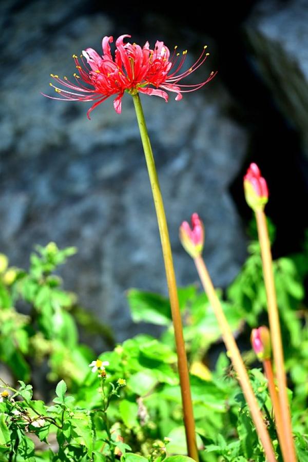【本報訊】延遲近一個月之後,近日終於在東引燈塔、一線天等地看見紅花石蒜的花影。然而,今年的花況依舊稀少零落,與8月初滿山盛放的換錦花難以相比。