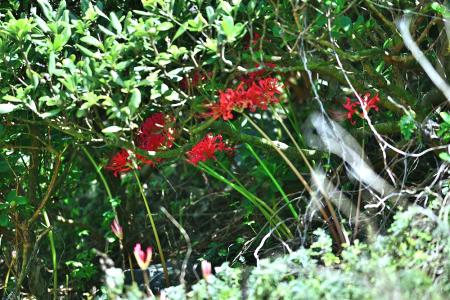 東引紅花石蒜姍姍綻放,棲地受海桐等植物強勢占領,花影是越來越稀疏。(圖/文:陳其敏)