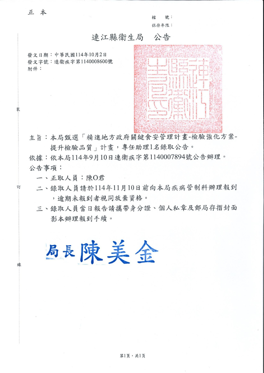 衛生局「精進地方政府關鍵食安管理計畫-檢驗強化方案-提升檢驗品質」專任助理1名錄取公告
