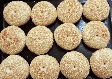 發酵完成,排氣,分割成六十克一顆的小麵糰,揉圓,壓扁,桿成大約直徑八公分左右的小圓餅,刷上水沾滿芝麻,中間戳個可愛的酒窩,戳大一點,等等澎了洞會變小。
