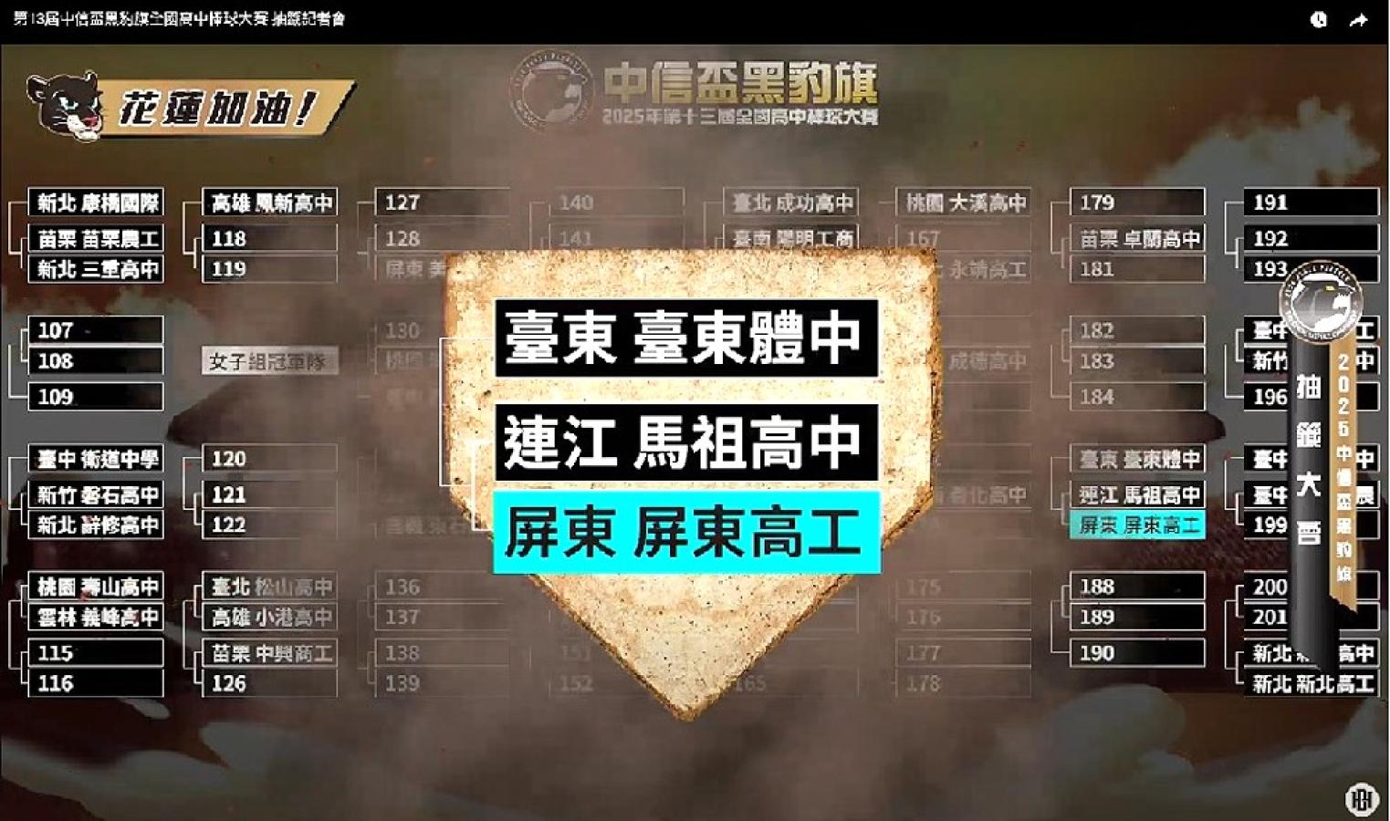 第13屆黑豹旗棒球賽5日進行賽程抽籤,馬祖高中首戰將對上屏東縣屏東高工。(圖:馬祖高中、黑豹旗轉播)