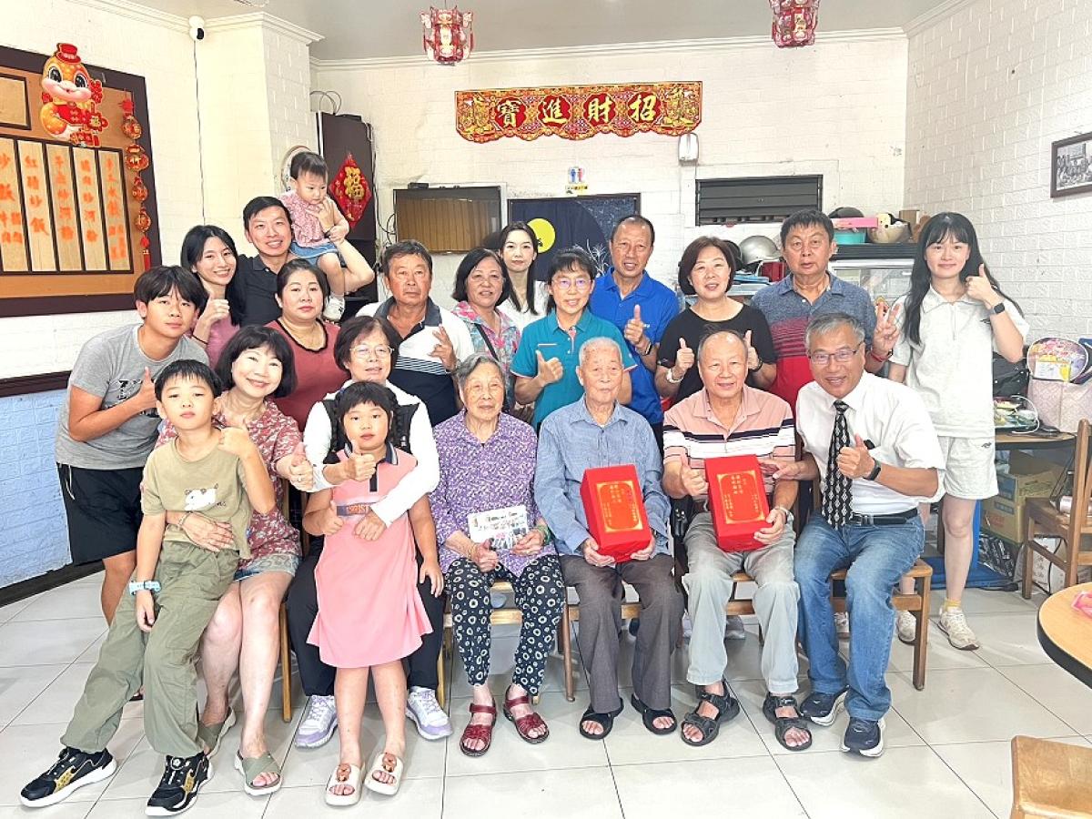 民社處長曾玉花代表縣長王忠銘送上祝壽賀禮,家屬也準備滿桌的點心、甜湯分享過生日的喜悅。