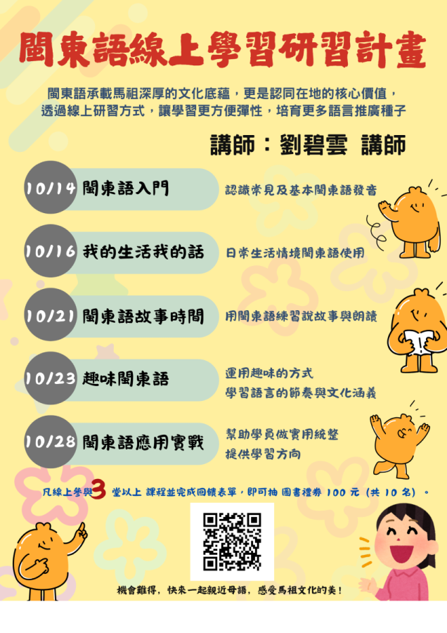 【本報訊】為推動在地語言保存與文化傳承,連江縣政府文化處特別推出「閩東語線上學習研習計畫」,以數位方式讓學員突破時間與空間的限制,利用晚間時段在家即可參與課程。文化處表示,閩東語不僅承載馬祖深厚的文化底蘊,更是凝聚在地認同的重要核心,透過線上研習課程,不僅能提高學習的便利性與彈性,也能培養更多語言推廣種子,進一步讓閩東語走入日常生活。(報名連結:https://reurl.cc/89mOdg)