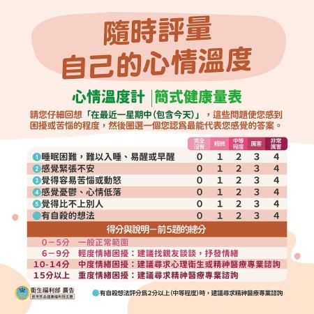 這些自我檢測工具可以幫助我們更了解自己的心理狀態,但它們僅供參考,無法取代專業評估。如果結果顯示可能有心理困擾,建議與親友討論,或尋求專業人士的協助,找到適合自己的支持與資源。關心自己,也別忘了適時尋求幫助!