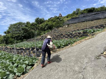 我在自由活動時,步行到我居住民宿附近的田園裡遊走。暖暖的太陽升起,一大片高麗菜梯田出現在眼前,我拿起相機拍下清晨的這一片美景,這時我從我相機螢幕上,看見田地裡有位彎腰正在挖掘農田的阿婆,於是我往她工作的方向走過去。