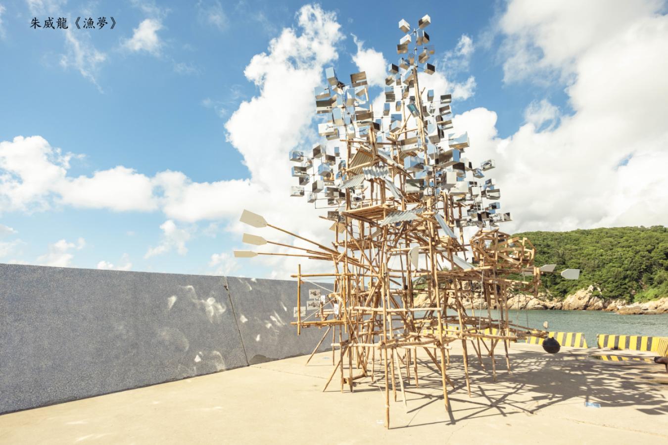 《漁夢》/藝術家:朱威龍, 馬祖漁民迎潮出海,於礁岸間撒網捕魚,漁火點點,映照出與海共生的世代記憶。本作品以機械動力形式重構馬祖漁村的意象,融合太陽能與風力驅動拍楸漁網、浮球、船槳、魚型與風力裝置等元素,營造出如夢似幻的機動城堡景象。在裸露的機械結構中,展現純粹物理動能的節奏與美感,體現工藝與自然之間的動態對話。此作象徵著海上捕魚生活的軌跡,寄託對故鄉的深情思念,亦承載著對移動家園的詩意想像。 展點:南竿山隴澳口
