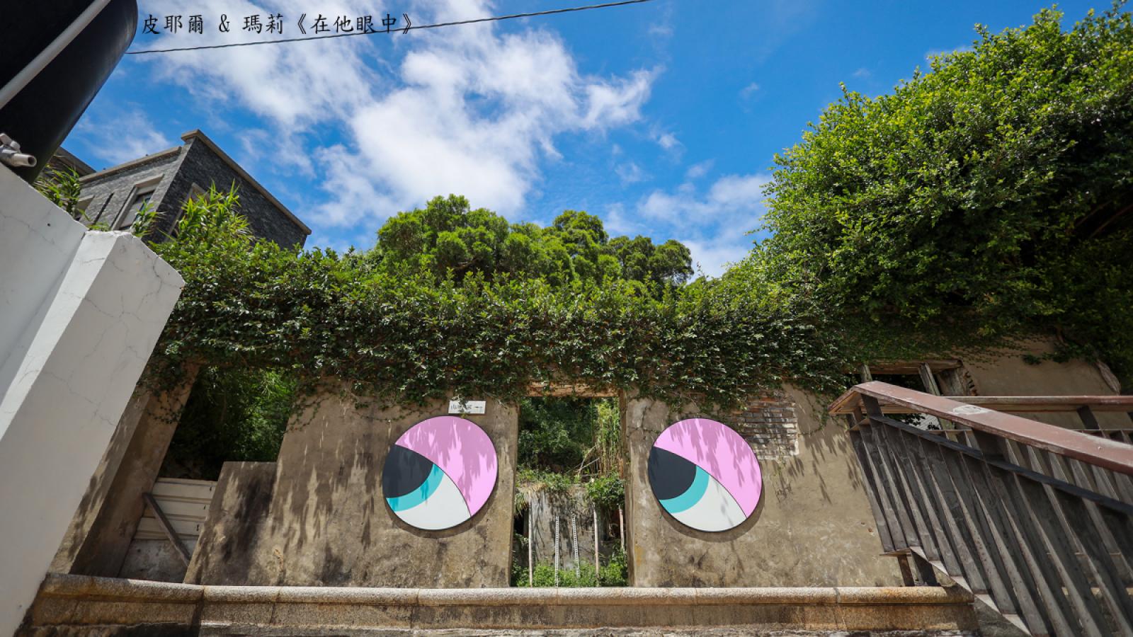 《在他眼中》/藝術家:皮耶爾 & 瑪莉 ,《在他眼中》以巨大醒目的眼睛改造環境建築,讓建築物彷彿擁有生命,營造出一種被窺視的詭異感。這些擬人化的結構既富玩心又令人不安,令人聯想到喬治‧歐威爾筆下的「老大哥」,探討在監控資本主義時代中,我們與數位平台之間不安卻默許的共生關係。這些眼睛是警戒的哨兵,反映出驚奇與控制之間微妙的界線,也提醒我們以好奇、謹慎與關懷的眼光繼續觀看。 展點:西莒中正門、西莒青帆聚落舊辦公室、西莒加油站旁、西莒西坵村口、田澳老人活動中心