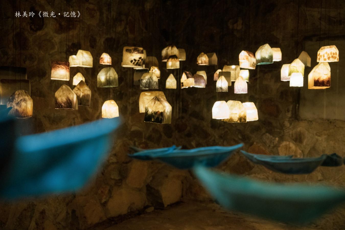 《微光‧記憶》/藝術家:林美玲, 從岸邊望向小島,錯落有致的老屋沿著陡坡延展,在記憶中靜靜佇立。微弱的光透過窗欞灑出,像是在夜裡為思鄉的人指引方向。 哪怕隔得再遠,那熟悉的微光也足以辨識家的所在。 沿著追光的方向前行,心中悄悄幻想—若能再次與家人團聚於此,將是多麼難得的一幕。 展點:東引鄉倉庫