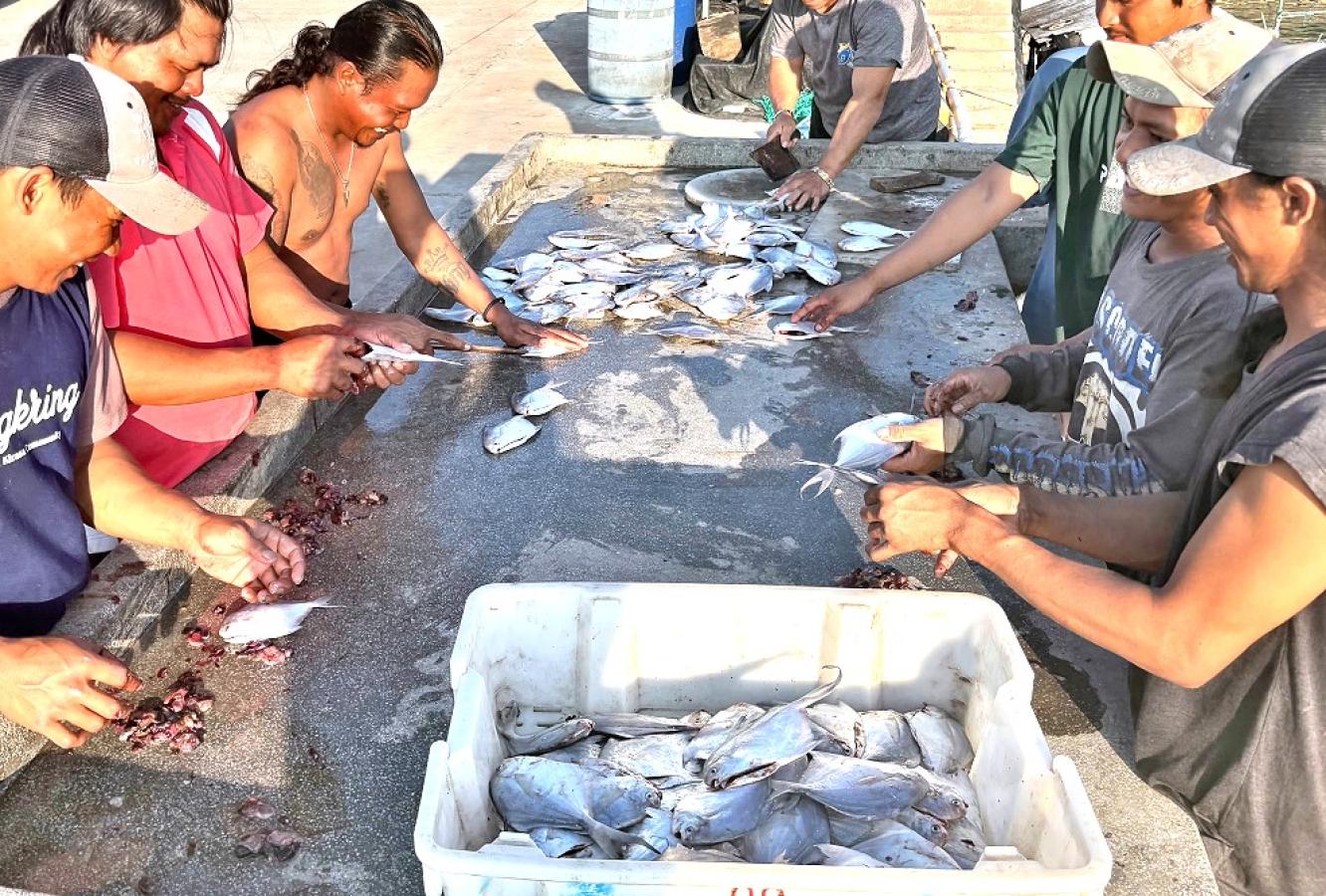 傍晚時分,漁船陸續返港,碼頭邊一片忙碌景象。許多民眾趁機前來採買,有人甚至一次帶走整簍筐。只見一排漁工分工合作,熟練地剖魚、去內臟,動作俐落而有默契,伴隨著笑聲與海風,洋溢著豐收的喜悅。短短時間內,一筐筐新鮮的小白鯧便處理完畢,整齊裝袋交給買家。
