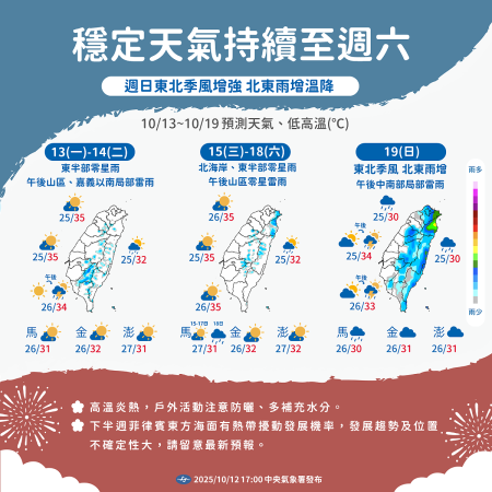 氣象署預報指出,受太平洋高壓影響,馬祖連日晴朗炎熱,但週日(19日)起東北季風增強,氣溫將明顯下降。屆時迎風面轉為多雲有雨,白天高溫降至30度左右,夜間低溫下探24至26度,體感轉為涼爽。