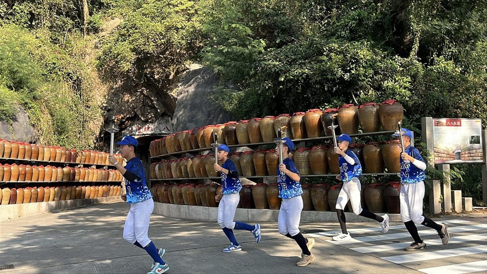 114年全運會大會聖火昨天傳抵馬祖,馬祖高中棒球隊擔任聖火隊,縣長王忠銘在縣府前迎接。(圖/文:馮紹夫)