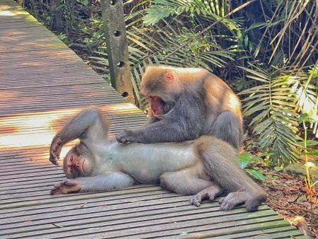 正當我沉醉於這一連串的奇景時,步道旁忽然傳來悉悉簌簌聲響。循聲望去,一群台灣獼猴正自在遊走。素聞柴山獼猴以潑辣著稱,常見其搶奪食物、嚇壞遊人,然而眼前的畫面卻全然不同。只見牠們彼此依偎,一隻為另一隻細心剔除毛髮間的雜物,像母親替孩子整頓衣裳;另一隻則伸手輕撫同伴的背脊,宛若兄弟間的安慰。這些舉動,不是掠奪的野性,而是家庭的柔情。