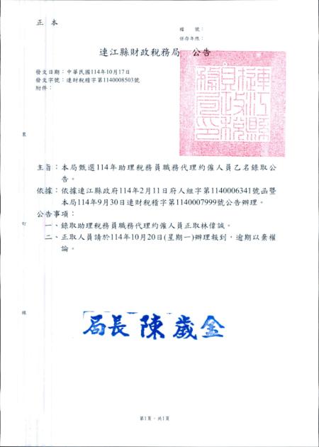 財政稅務局甄選助理稅務員職務代理約僱人員錄取公告