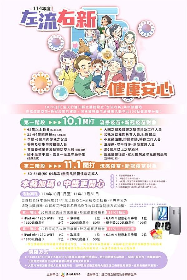 為鼓勵民眾踴躍接種疫苗、提升群體免疫力,衛生局特別舉辦「左流右新,健康安心,中獎更開心」抽獎活動。凡於12月31日前完成公費流感及新冠疫苗兩劑接種者,即可獲得抽獎資格,獎項包括冷凍櫃、iPad、健康心率手環、商品卡等多項豐富好禮。詳細活動資訊請參閱連江縣衛生局官網(https://reurl.cc/DOkxXQ)。