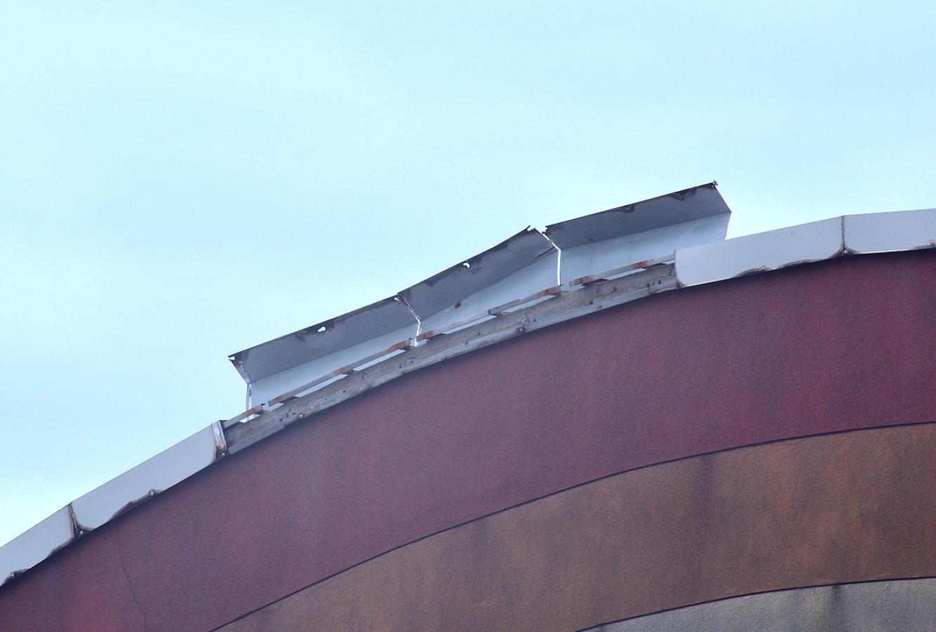 體育館屋頂邊緣共有三處鐵皮被強風掀起。鄉公所原計畫待風勢減弱後再進行修繕,但考量到強風天氣預計將持續數日,深怕已鬆動的鐵皮結構會進一步造成大面積飛脫,不僅嚴重危及建築物結構安全,更對下方人車構成潛在風險,同時也必須立即處理巨大的聲響造成的鄰近民眾心理不安。