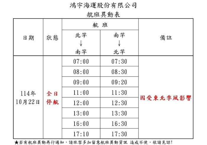 為旅客及航行安全,10月22日航班異動如上表,造成不便,敬請見諒,謝謝!