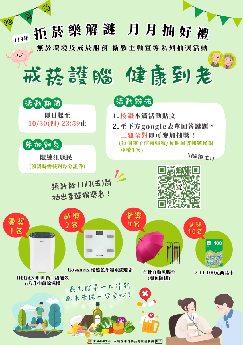 守護你的腦!成為健康守門人⚔️ 吸菸會讓血管硬化、變窄, 腦中風就像潛伏的敵人,隨時可能發動攻擊, 但別怕—— 你的武器是【戒菸行動】!! 10/29世界腦中風日,一起出任務! 解謎、戒菸、抽好禮,一次搞定! 從今天開始,把菸霧趕出生活! 活動時間:114年10月22日至10月30日23:59止 活動連結:FB活動貼文