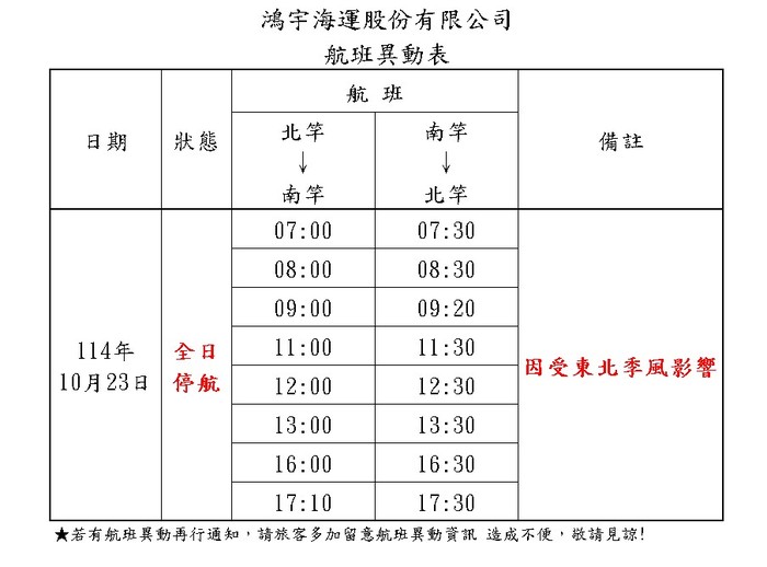 為旅客及航行安全,10月23日航班 全日停航(如上表),造成不便,敬請見諒,謝謝!